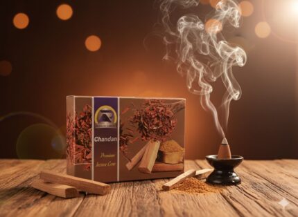 Product Highlights • Fragrance: Warm, woody aroma of pure sandalwood. • Type: Premium hand-rolled incense cones. • Burn Time: Approx. 30–35 minutes per cone. • Quantity: Pack of 20 cones. • Use: Ideal for meditation, puja, and spiritual practices. • Origin: Made with natural sandalwood powder and herbal binders. Why Choose Chandan Premium? • Sacred Aroma: Sandalwood is known for purity and divine connection. • Eco-Friendly: 100% herbal, no synthetic chemicals. • Spiritual Calm: Enhances focus during meditation and prayer. • Traditional Value: A timeless fragrance in Indian homes and temples.